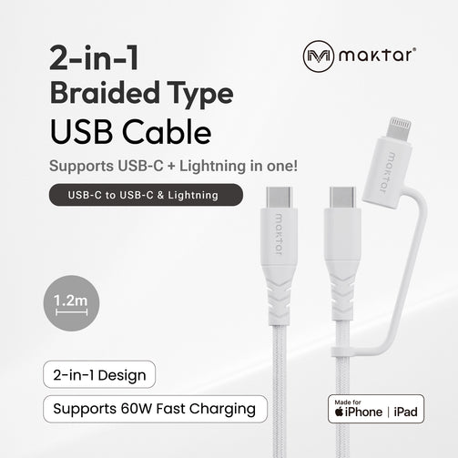 Maktar CCL 2-in-1 USB-C to Lightning Cable, MFi Certified, Nylon Braided, Fast Charging, 60W Output, 1.2m Length
